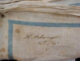 ‘There could be no doubt of identity. From the pocket of the gray waistcoat was drawn a white pocket handkerchief with a plain blue border. [left] It was as strong and sound as if new; the marking-ink might have been used upon it that day so distinct were the works [sic]:
